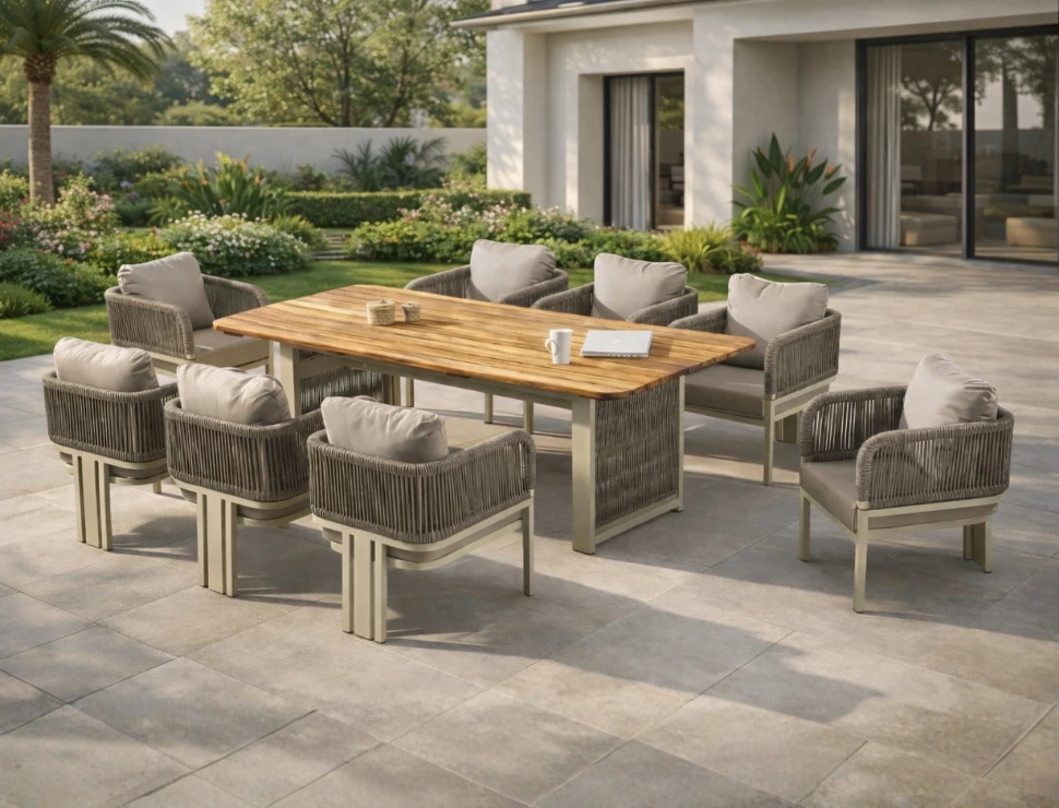 Alüminyum gövdesi sayesinde hafif ama sağlam bir yapıya sahip olan Elvira Masa Takımı, dış mekân koşullarına karşı dayanıklıdır. Şık ip detaylı kolları modern bir estetik katarken, kalın dolgulu minderleri uzun oturumlarda üst düzey konfor sunar. Ahşap masa yüzeyi hem doğal bir görünüm hem de işlevsellik kazandırır. Balkon, bahçe ve teras gibi alanlarda keyifli ve estetik bir oturma alanı oluşturmak isteyenler için ideal tercihtir.