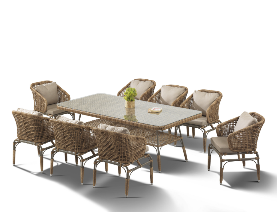 Morris Yemek Takımı, doğal rattan görünümü ve cam detaylı masa tasarımıyla şıklığı ve fonksiyonelliği bir arada sunar.